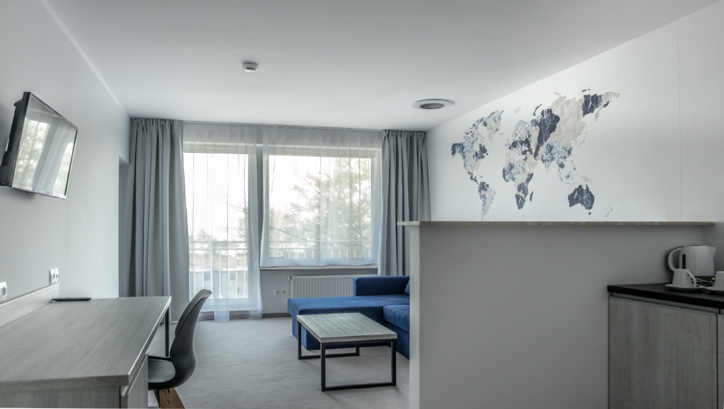 Jako jedyni posiadamy apartament z oddzielną zamykaną sypialnią, a także salon z rozkładanym narożnikiem dla dwóch osób, aneksem kuchennym, łazienką, przedpokojem i przestronnym balkonem z urzekającym widokiem na Jezioro Jamno.